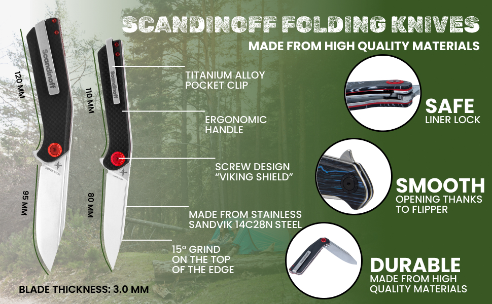 A massive, strong and durable folding pocket knife with many original Nordic design elements, developed in the SCANDINOFF design studio.