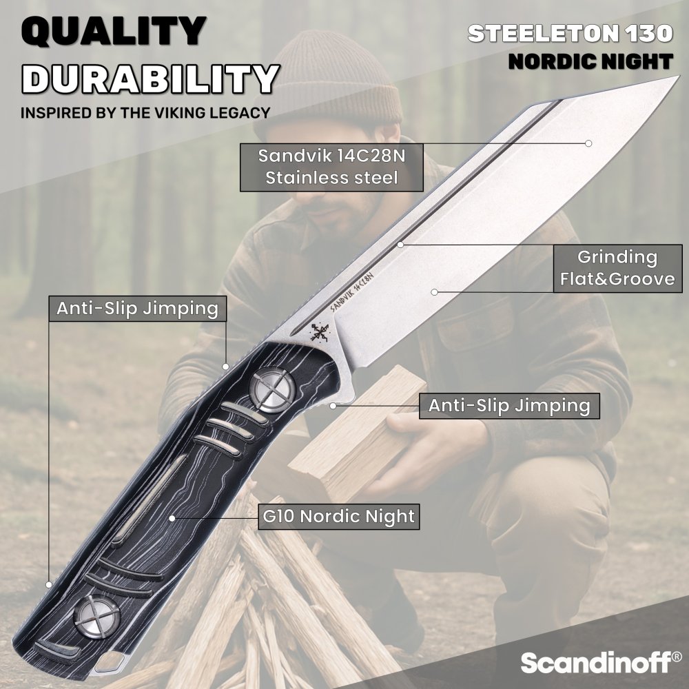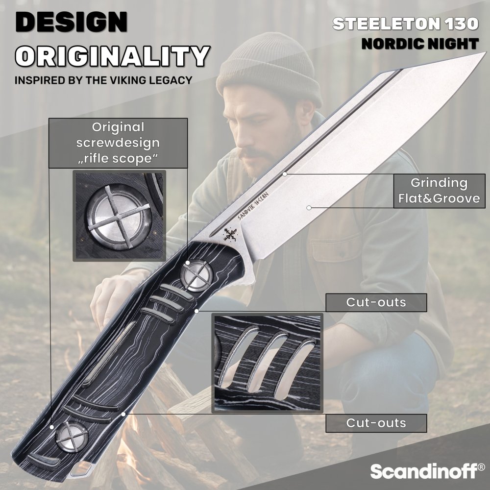 Imagine a tool so perfect that it becomes an extension of your hand. So durable that it won't shy away from any challenge. So precisely crafted that its beauty will captivate you at every glance. That's exactly what the STEELETON 130 -Nordic Night is - the pinnacle of knifemaking, where uncompromising functionality meets breathtaking elegance. More